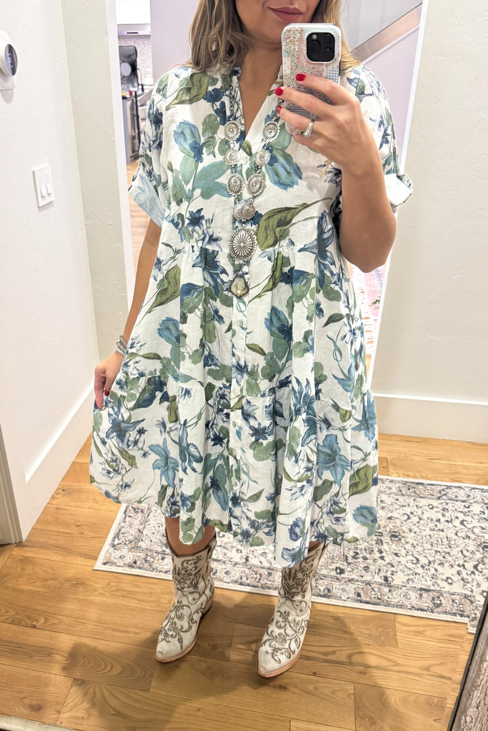 Coastal Floral Linen Dress - Made In Italy - 100% Linen