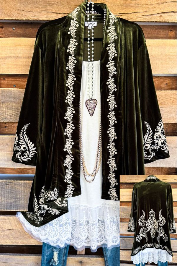 AHB EXCLUSIVE: Crushed Velvet Embroidered Cardigan - Olive