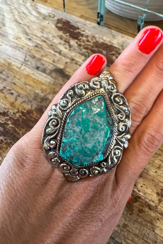 Set in a bold 2” silver plated overlay design, this piece was made to stand out. It’s that statement ring that pulls your whole outfit together without even trying.