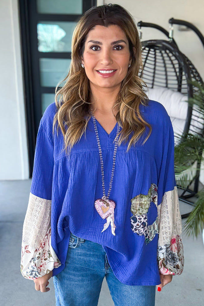 Patchwork Bloom Oversized Top - 100% Cotton  Blue